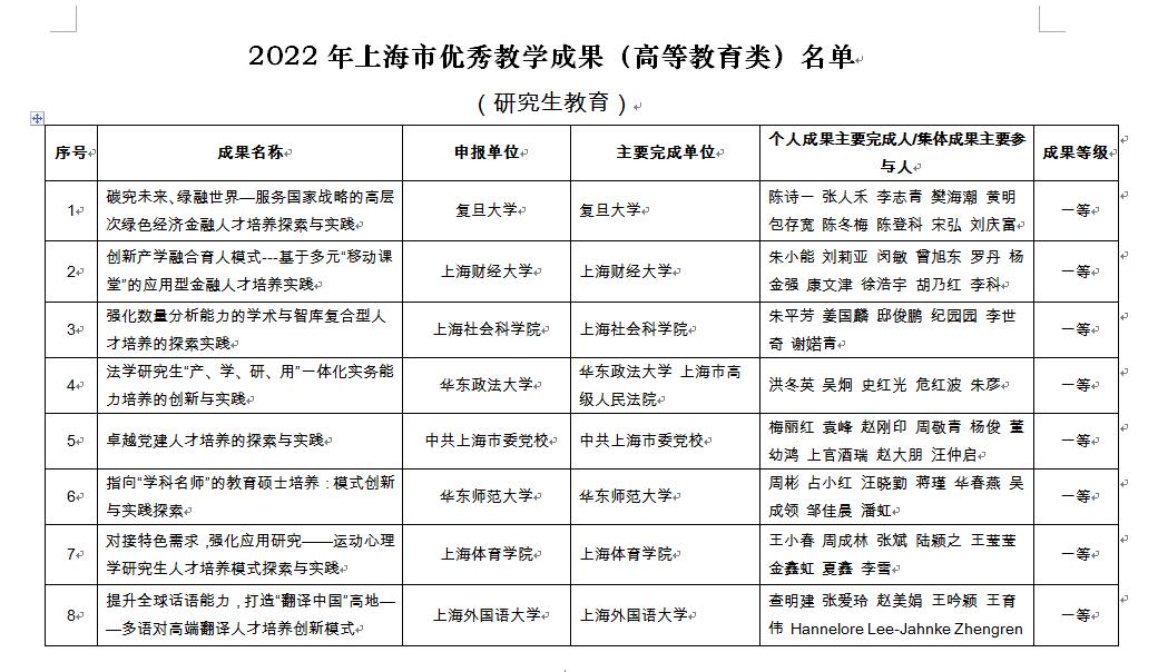 日前,上海市教育委员会公布了2022年上海市优秀教学成果获奖名单,我校申报的一项高等教育类(研究生教育)教学成果《卓越党建人才培养的探索与实践》荣获2022年上海市优秀教学成果奖一等奖。 《卓越党建人才培养的探索与实践》教学成果由研究生部牵头组织申报,主要完成人是梅丽红、袁峰、赵刚印、周敬青、杨俊、董幼鸿、上官酒瑞、赵大朋和汪仲启。这一教学成果是我校近年来探索研究生培养新模式,努力形成党校研究生教育特色取得的创新性成果,也是我校实施“上海一流研究生教育培养引领计划项目”——“卓越党建人才培养引领计划项目”的阶段性成果。该项目聚焦全面从严治党战略需求,主动对接新时代上海党建要求,充分发挥党校研究生教育的办学优势,按照一流研究生教育的标准,培养社会亟需的创新型、应用型、复合型优秀青年党建人才,并形成与高校错位竞争、共同发展的学科发展和研究生培养体系。目前该项目共获得市教委支持资金近280余万元。第一期、第二期项目已经市教委组织专家评审,顺利结项。目前第三期项目正在实施,第四期项目已完成申报。 据悉,上海市优秀教学成果奖由上海市人民政府设立,是目前上海市教育领域政府类最高奖励,每4年评选一次。从2013年起,上海市优秀教学成果分为高等教育、基础教育和职业教育三个大类。2022年上海市优秀教学成果奖评选于2021年11月启动。我校高度重视此轮上海市级教学成果奖申报,坚持自下而上、统筹规划的工作原则,研究生部积极组织和发动全校从事研究生教育教师参与到申报工作中。我校在由校委会评出首届校级研究生教育优秀教学成果奖基础上,首次参加市级高等教育优秀教学成果奖评定。